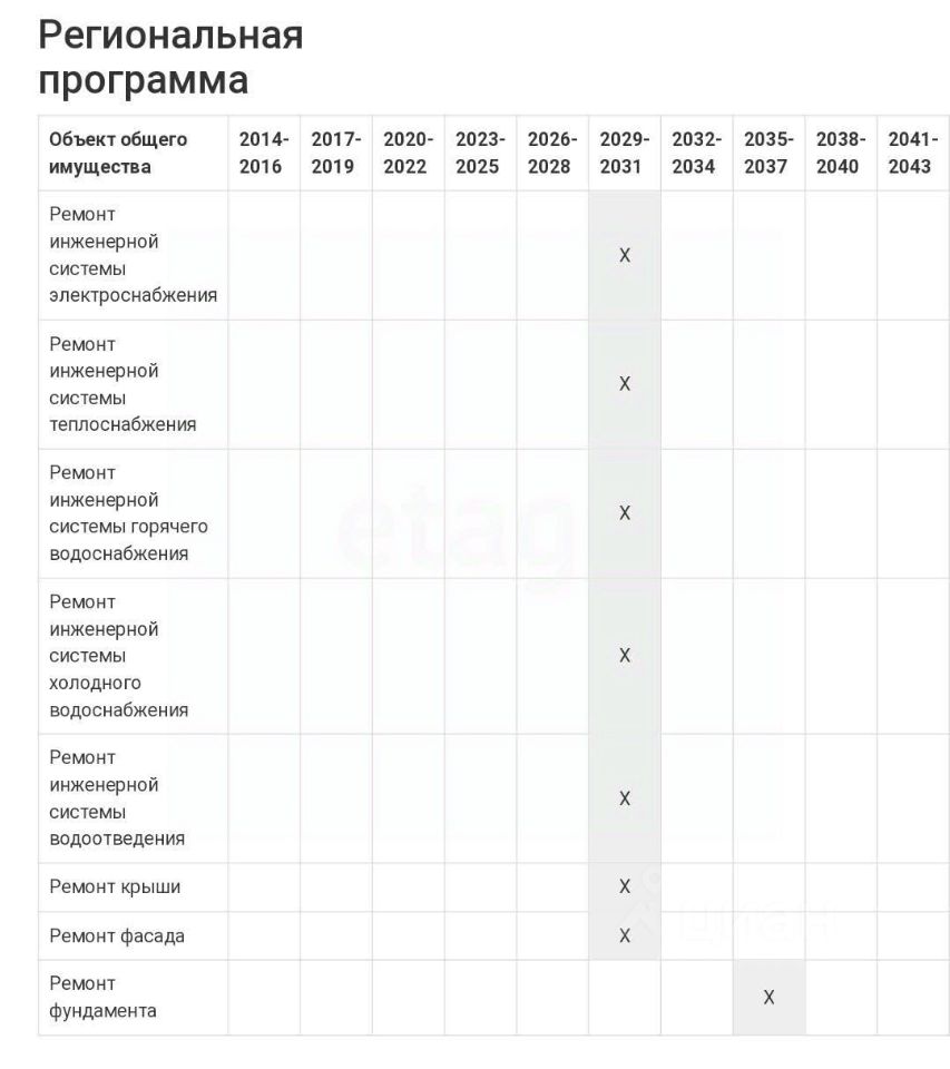 УПРАВЛЯЮЩАЯ КОМПАНИЯ ''КОВЧЕГ'' Региональная программа по капитальному ремонту расписана с 2029 по 2031 год: система электроснабжения, теплоснабжения, горячего и холодного водоснабжения, водоотведения, ремонт фасада и крыши.